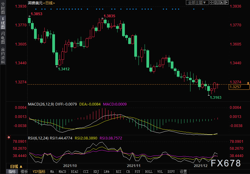周一(12月13日)英镑兑美元小幅下跌,此前一度跌至1.3222,欧洲时段收复部分失地,目前交投于1.3250附近,日内美元再度走强。