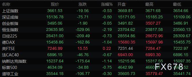 美股收盘情况:道琼斯指数收盘下跌105.26点,跌幅0.30%,报35545.69点;标普500指数收盘下跌31.75点,跌幅0.68%,报4637.40点;纳斯达克综合指数收跌175.6点,跌幅1.14%,报15237.6点。