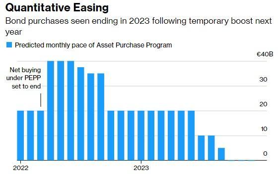 欧洲央行明年料扩大债券购买,随后在2023年结束,下图中的蓝色柱代表预测的每月资产购买规模