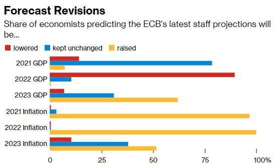 至于欧洲央行对欧元区通胀和经济增长的预测,经济学家的预测如下,其中红色柱代表下调,蓝色柱代表维持不变,黄色柱代表上调
