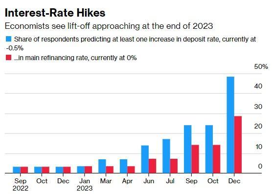 经济学家们表示,欧洲央行将上调通胀预期,同时预计明年的经济增长前景将被下调。9月份,欧洲央行预计,2022年通胀率将降至1.7%,2023年降至1.5%。