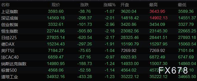 美股收盘情况:标普500指数下跌1.1%,报4568.02点;道琼斯工业平均指数下跌1.2%,报34932.16点;纳斯达克综合指数下跌1.2%,报14980.94点;纳斯达克100指数下跌1.1%,报15627.64点;罗素2000指数下跌1.6%,报2139.875点。