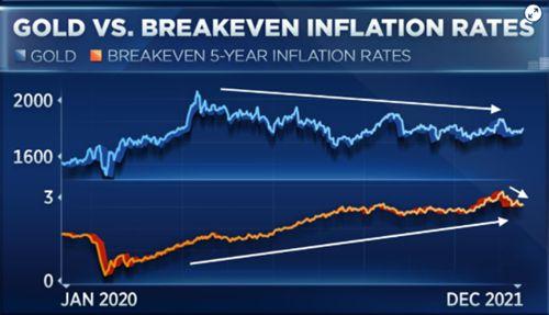 他指出,自2020年初以来,金价相对于五年通胀率、比特币和房地产投资信托基金(REITS)的盈亏平衡出现了下滑。