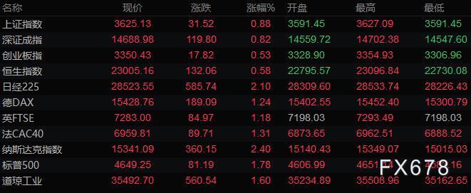 美股收盘情况:标普500指数上涨1.8%,报4649.23点;道琼斯工业平均指数上涨1.6%,报35492.7点;纳斯达克综合指数上涨2.4%,报15341.09点;纳斯达克100指数上涨2.3%,报15986.28点;罗素2000指数上涨2.9%,报2202.947点。