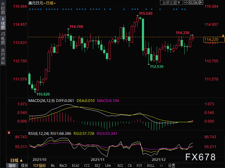 周三(12月22日)美元兑日元突破盘中盘整阶段,在欧洲时段跃升至114.33附近的月度新高,日内市场风险偏好上升,另外日本央行会议纪要偏鸽。