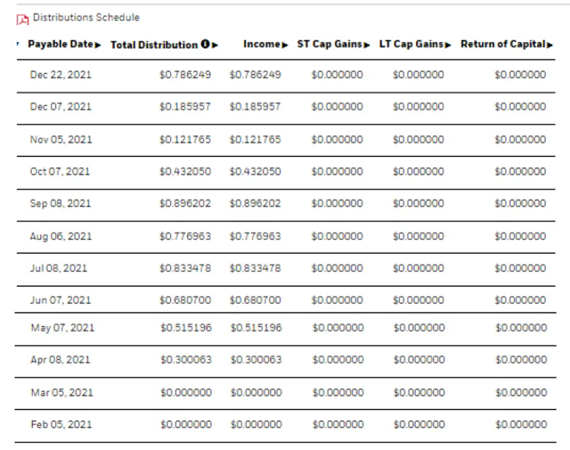 在下面的表格中,总共有12次调整。每次调整投资者都会按期投资时间表获得收益。有些人可能会注意到,2021年的分配在1月份为零之后逐渐增加。这都是因为TIP的基准指数是彭博美国TIPS指数,而后者纯粹是根据CPI数字调整的。在这种情况下,从《贸易经济学》(Trading Economics)的美国通胀率演变来看,CPI从1月份的1.4%逐渐上升至7月份的5.4%,12月份大幅上升至6.8%。这解释了为什么2021年最后一个月的分布是最高的。