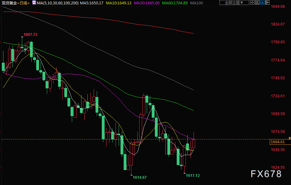 金价周三升至两周高位,因市场预期美联储将从12月开始收敛其激进的加息立场,拖累美元和美债收益率下滑。现货金上涨0.8%,至每盎司1665.09美元,盘中触及10月13日以来最高。