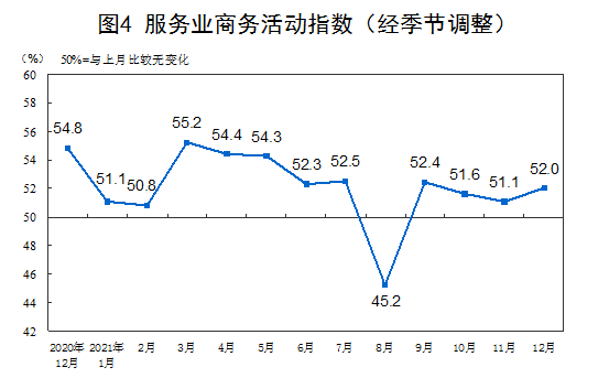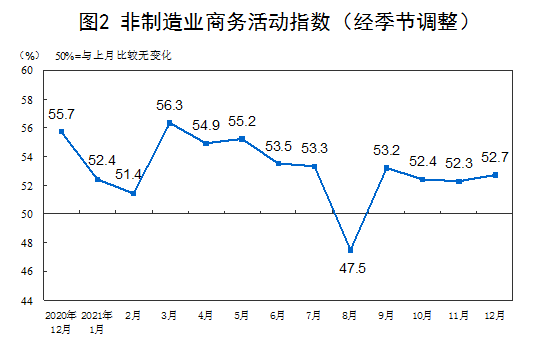 12月份,非制造业商务活动指数为52.7%,比上月上升0.4个百分点,高于临界点,非制造业恢复步伐加快。