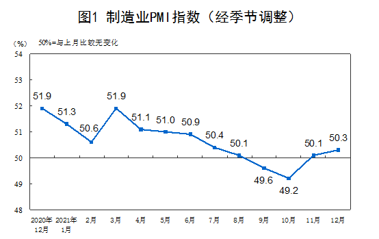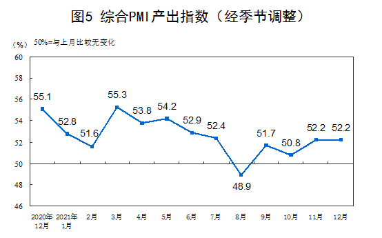 12月份,综合PMI产出指数为52.2%,与上月持平,表明我国企业生产经营活动总体稳定扩张。