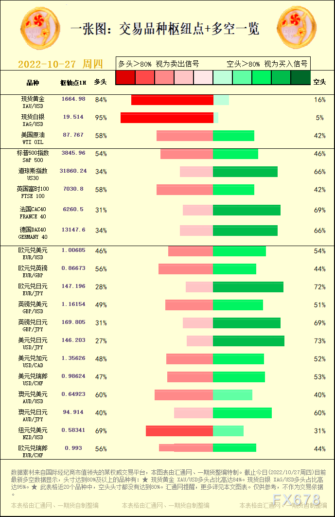 一张图:交易品种枢纽点+多空占比一览。截止今日(2022/10/27周四)目前最新多空数据显示,头寸达到80%及以上的品种有:★ 现货黄金 XAU/USD多头占比高达84%。现货白银 XAG/USD多头占比高达95%。★ 此表格近20个品种中,空头头寸都没有达到80%。,更多详见本文图表。仅供参考,不作为交易依据。