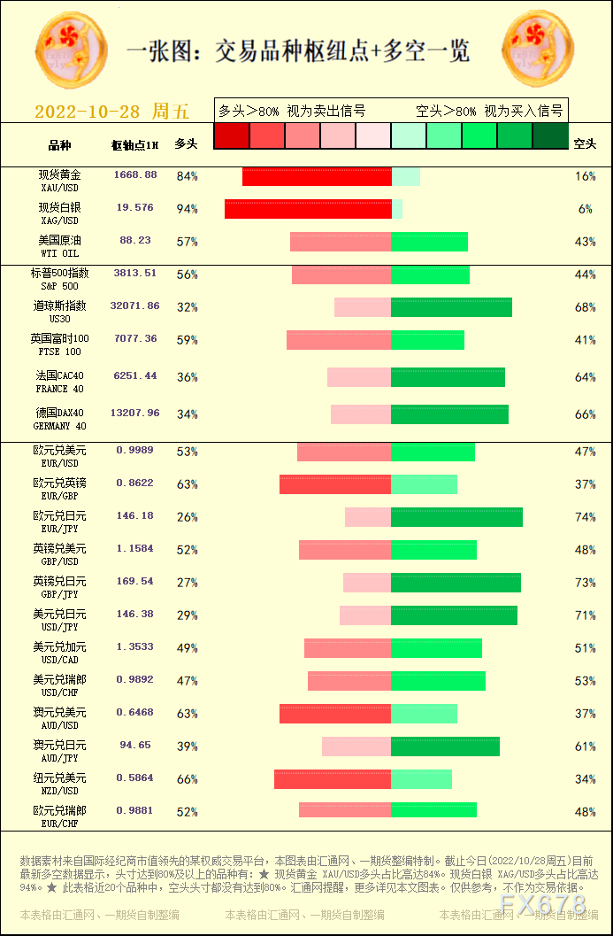 一张图:交易品种枢纽点+多空占比一览(2022/10/28周五)。截止今日(2022/10/28周五)目前最新多空数据显示,头寸达到80%及以上的品种有:★ 现货黄金 XAU/USD多头占比高达84%。现货白银 XAG/USD多头占比高达94%。此表格近20个品种中,空头头寸都没有达到80%。,更多详见本文图表。仅供参考,不作为交易依据。