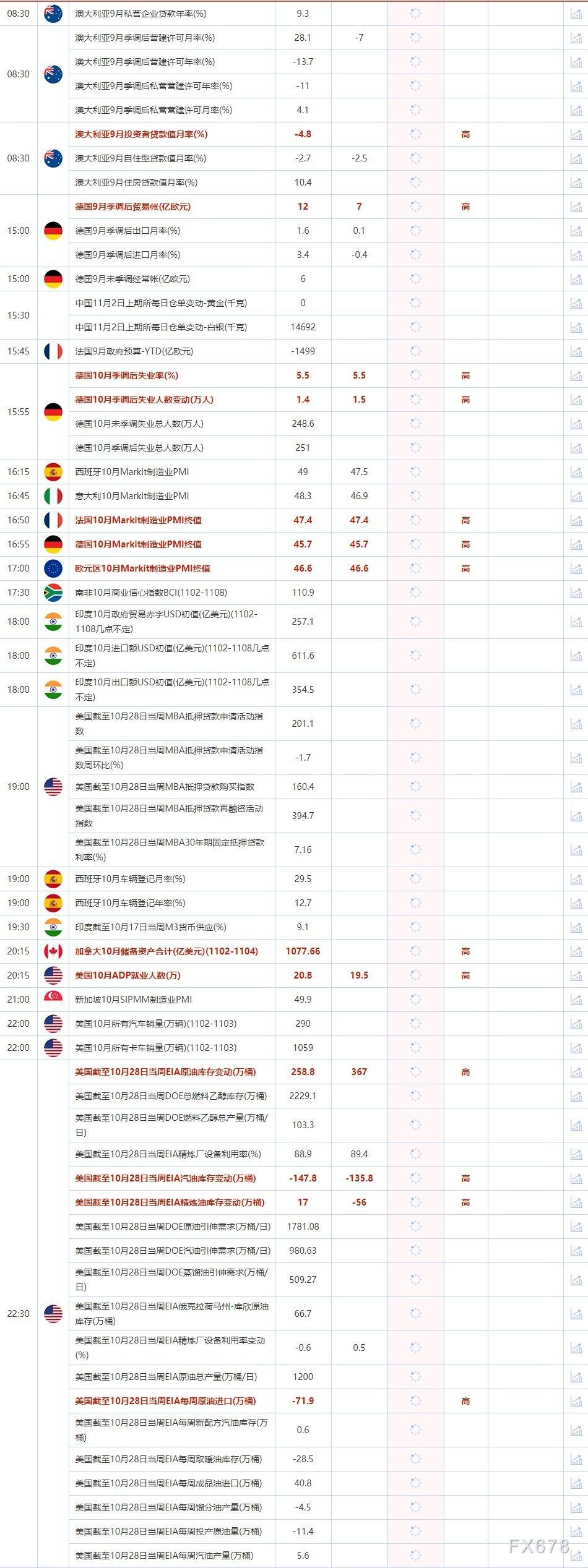 2022年11月2日,全球主要经济体将公布经济数据,需重点关注法国、德国、欧元区和美国10月Markit制造业PMI终值,美国10月ADP就业人数,美国截至10月28日当周EIA原油库存变动。大事方面需关注:欧洲央行管委维勒鲁瓦发表讲话,美国总统拜登就基础设施发表演讲。