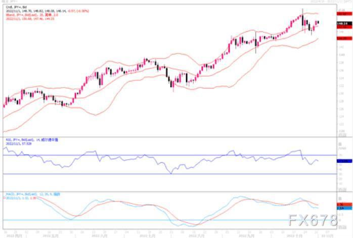 美元走强压制非美货币,英镑周一走势承压,小幅收跌;当天开盘1.1605,收盘1.1469。尽管英国可能将面临经济衰退,且新任首相苏纳克削减开支可能加深经济衰退。但市场预期英国央行周四(11月3日)将会开启第八次会议升息以控制超过10%的通胀,市场认为英国央行11月3日升息75个基点至3%的可能性约为90%。