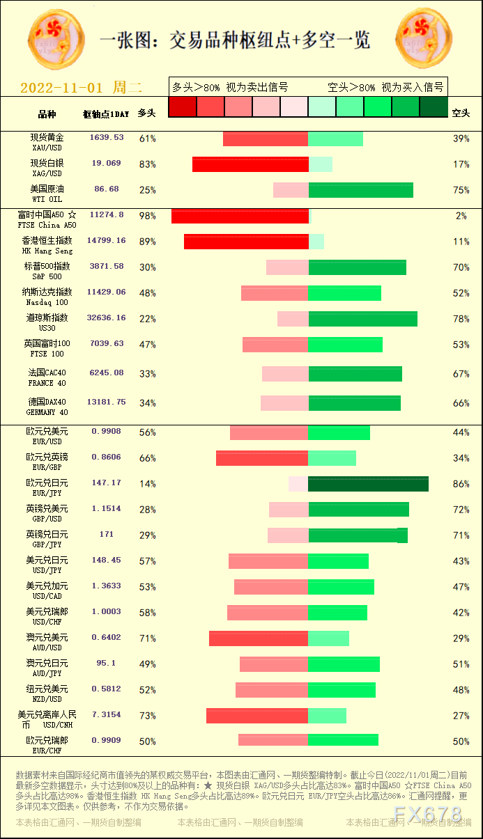 一张图:交易品种枢纽点+多空占比一览(2022/11/01周二)。截止今日(2022/11/01周二)目前最新多空数据显示,头寸达到80%及以上的品种有:★ 现货白银 XAG/USD多头占比高达83%。富时中国A50 ☆FTSE China A50多头占比高达98%。香港恒生指数 HK Hang Seng多头占比高达89%。欧元兑日元 EUR/JPY空头占比高达86%。,更多详见本文图表。仅供参考,不作为交易依据。