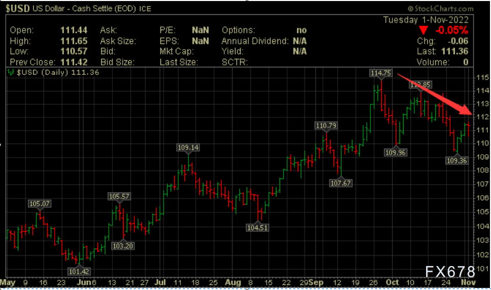 若从9月28日的高点114.78,到10月27日的低点109.53计算,美元指数在这段时期内累计下跌了4.6%,这是自2021年7月以来美元指数从52周高点回落录得的最大跌幅。