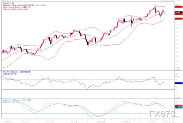 周二传出日本当局有干预行动消息下,美元兑日元出现回落行情,美元/日元在电子交易系统(EBS)上从148.82跌至148.14。但考虑到今天开始美联储召开11月份的议息会议,若美联储仍大幅加息75个基点,则要防范短线出现剧烈波动的风险。技术图形上,4小时图已跌穿短期均线下方,技术指标出现拐头向下的迹象。近期留意布林带中轨线147.50的支撑,若跌破上周低点145.00将成为前进的初步目标。而上方在150.00水平处 ,由于忌惮日本政府干预,恐会成为较为坚强的阻力位置。