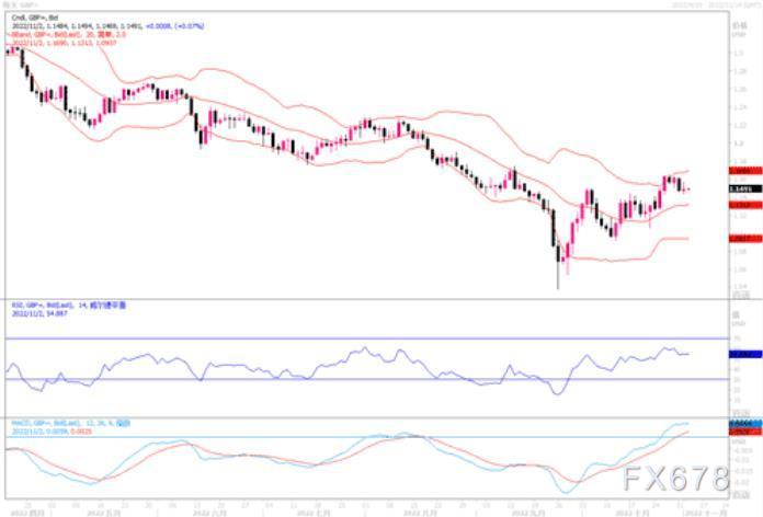 英镑兑美元周二走高。本周英国央行和美联储将进行政策会议,预计两家央行都将大幅加息。自9月触及1.0327历史低点以来,英镑/美元已上涨超过11%,原因是市场预期美联储可能会放缓收紧政策的步伐导致美元走软,而英国新政府的组建平息了政治动荡。但是,英镑仍然受到全球风险情绪左右,风险偏好改善时走强,风险偏好恶化时走弱。日图在MA100受阻回落,随机指标回落测试近期上升趋势线,暂时看震荡。4小时图下破1.1500维持弱势,但下跌动能不强,下方关注9月低点以来上升趋势线支持。小时图下行在1.1450上方整理,关注1.1500阻力。整体上,英镑兑美元仍保持在布林带上轨,此轮反弹轨道暂时未受到破坏。
