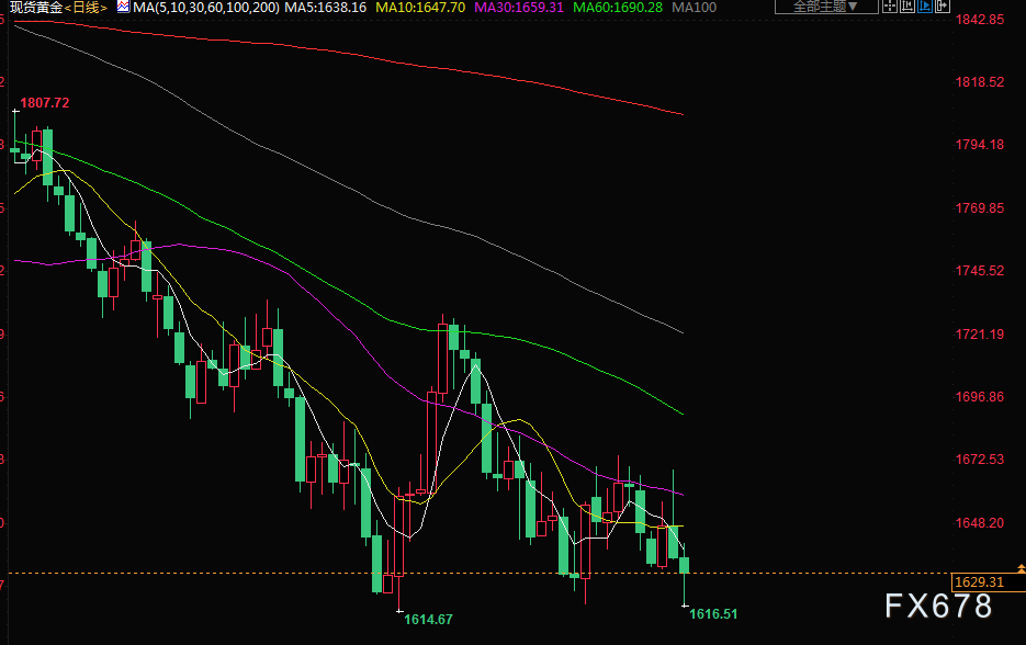 金价周四跌至逾一个月最低,在美联储主席鲍威尔做出鹰派发言后,美元和美国国债收益率跳升,打击了非孳息黄金的吸引力。现货金下跌0.3%,报每盎司1629.97美元,稍早一度下跌超过1%,触及9月28日以来最低。