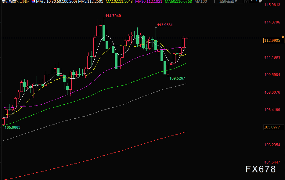 午后交易中,欧元兑美元下跌0.6%,至0.9758美元。这推动美元指数日内上涨0.7%,报112.86,稍早曾触及113.15的10月21日以来最高。