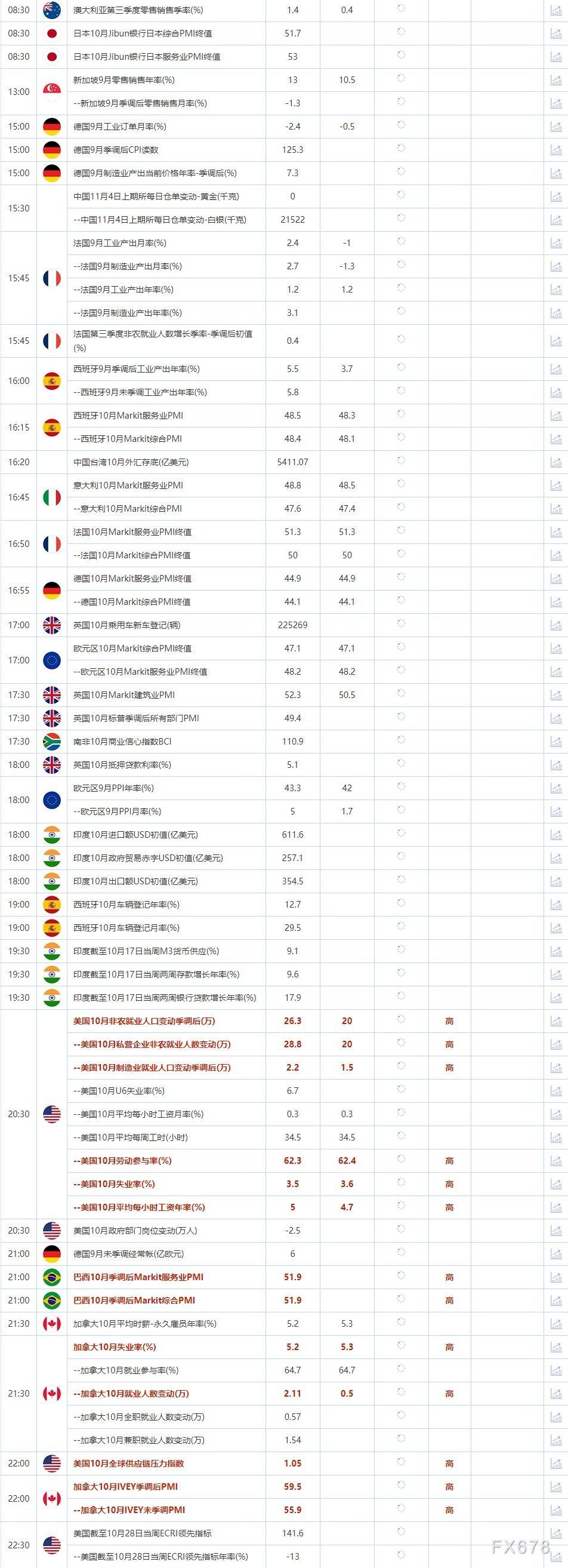 20:30 --美国10月平均每小时工资年率(%) , 前值 5 , 预期值 4.7 , 公布值:待发布