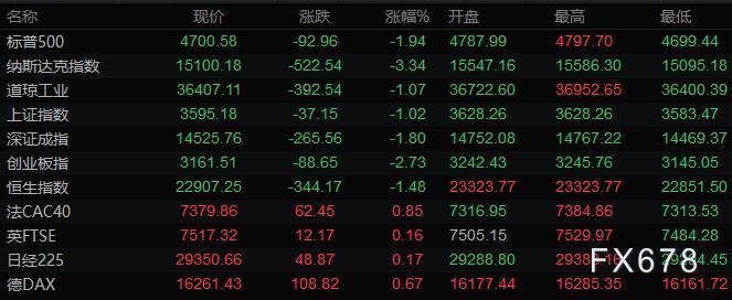 美股收盘情况:标普500指数下跌1.9%,报4700.58点;道琼斯工业平均指数下跌1.1%,报36407.11点;纳斯达克综合指数下跌3.3%,报15100.17点;纳斯达克100指数下跌3.1%,报15771.78点;罗素2000指数下跌3.3%,报2193.999点。
