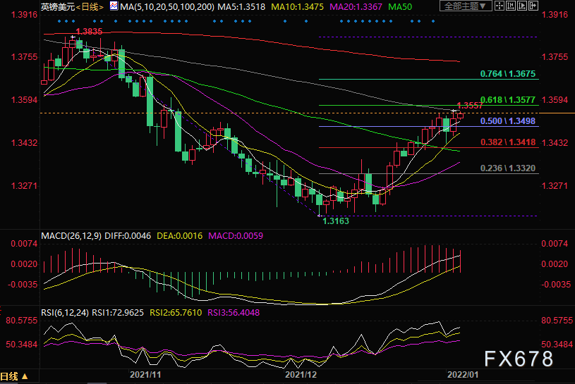 技术面来看呈正面格局,5日、10日和21日移动均线攀升,21日布林带区间上移,汇价下一个目标是测试10-12月跌势的61.8%回档位1.3577。