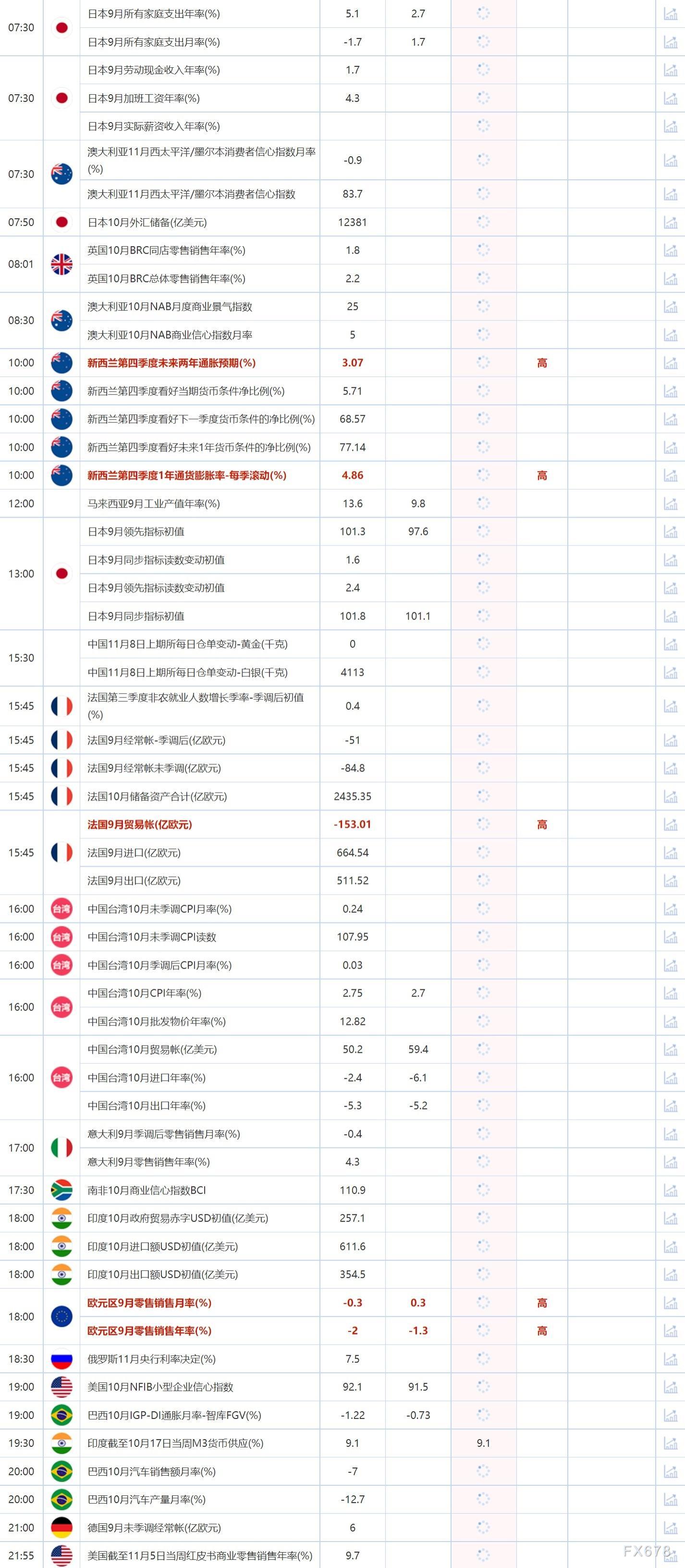11月8日,投资者需要关注的重点数据包括新西兰第四季度未来两年通胀预期,法国9月贸易帐,欧元区9月零售销售月率。需要关注的大事件包括日本央行公布11月货币政策会议审议委员意见摘要,英国央行货币政策委员曼恩发表讲话,美国参众两院举行选举。