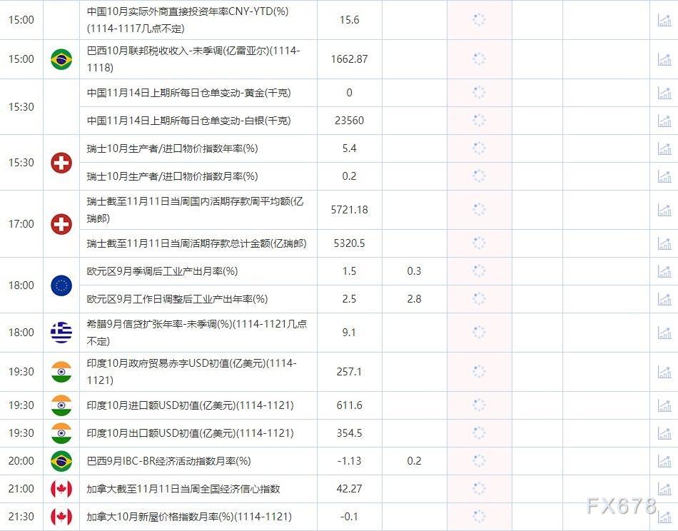 11月14日,投资者需要关注的重点数据:中国10月实际外商直接投资年率,欧元区9月季调后工业产出月率,加拿大10月新屋价格指数月率。需要关注的大事件包括:加拿大央行、英国央行、美联储和欧洲央行组织举行一场有关经济、财政与央行业务的多样性、公平性和包容性的会议,至11月15日;OPEC公布月度原油市场报告。