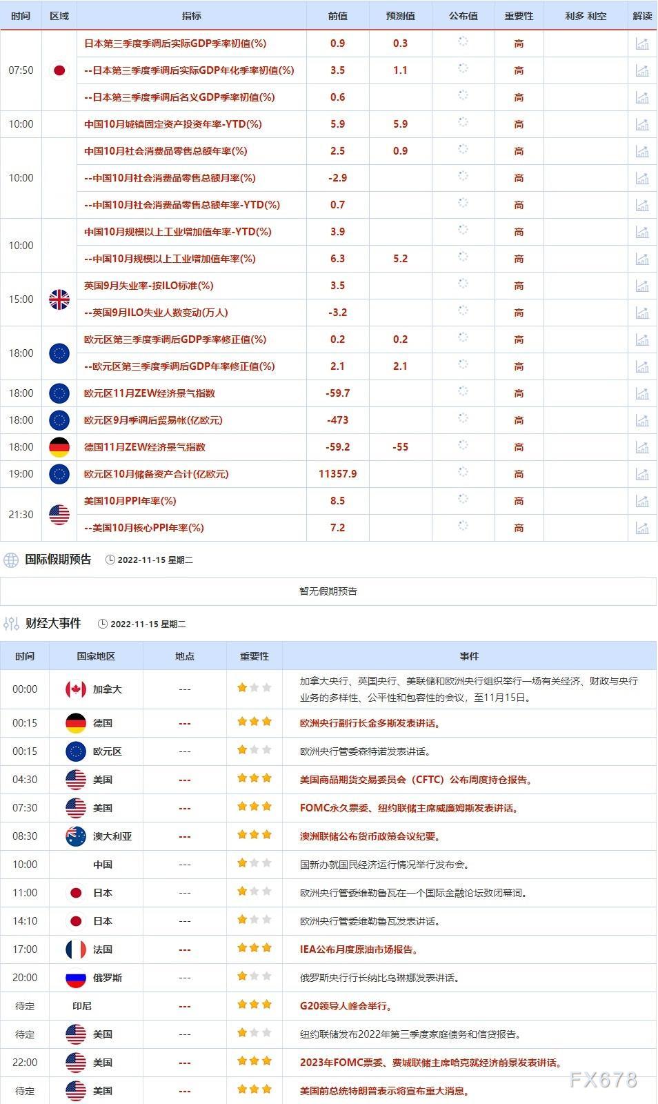 11月15日当天,欧洲央行副行长金多斯、纽约联储主席威廉姆斯和费城联储主席哈克都将发表讲话,投资者需关注他们对于经济和货币政策前景的最新观点。