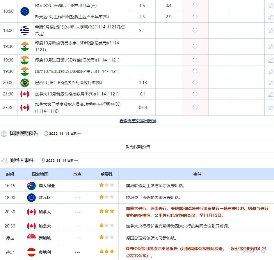 11月14日,加拿大央行、英国央行、美联储和欧洲央行组织举行一场有关经济、财政与央行业务的多样性、公平性和包容性的会议,至11月15日。此外,当天OPEC将公布月度原油市场报告,可能对油价走势有所影响,投资者需对此保持关注。