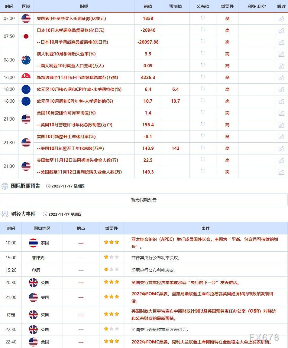 11月16日,纽约联储主席威廉姆斯以及欧洲央行行长拉加德都将发表讲话,投资者也需对此保持关注。