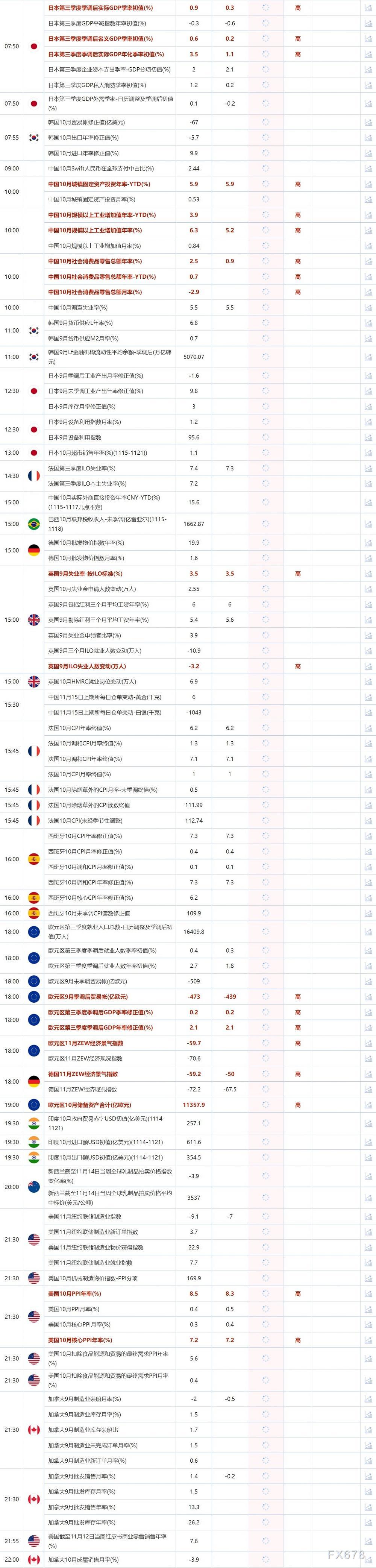 11月16日,需要关注的重点数据:英国10月CPI年率、未季调输入PPI年率和零售物价指数年率,美国10月进口物价指数月率和零售销售月率,加拿大10月CPI年率,美国10月工业产出月率和截至11月11日当周EIA原油库存变动。需要关注的大事件:G20领导人峰会,英国央行行长贝利出席国会听证会,纽约联储主席威廉姆斯和欧洲央行行长拉加德的讲话。