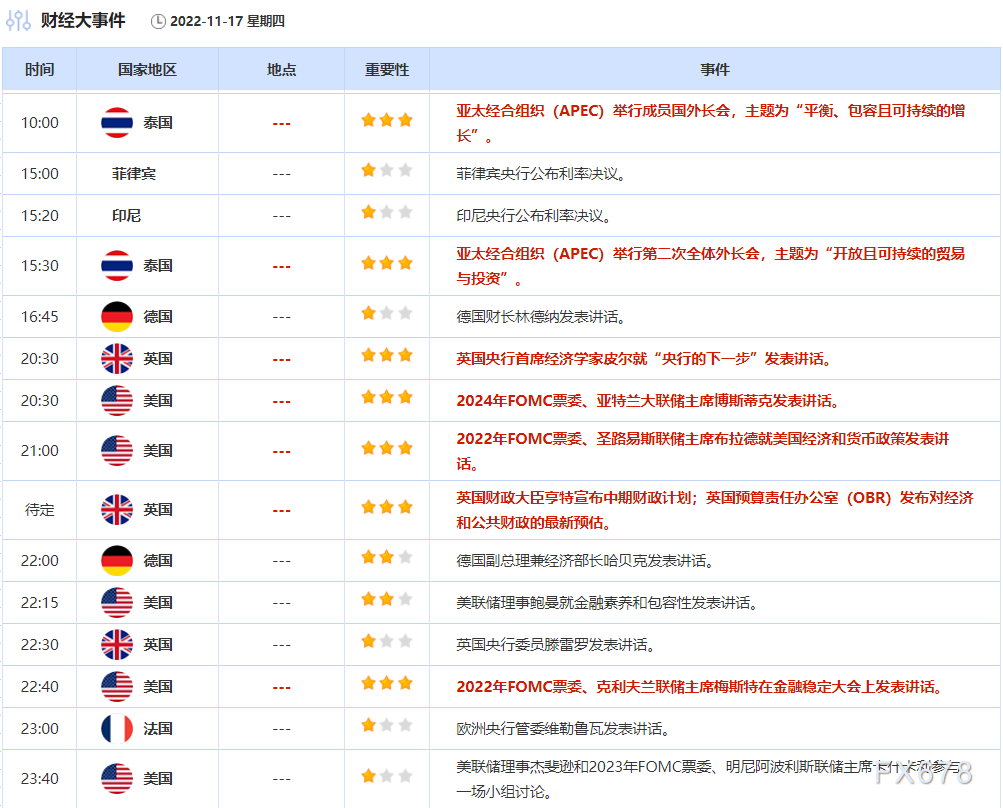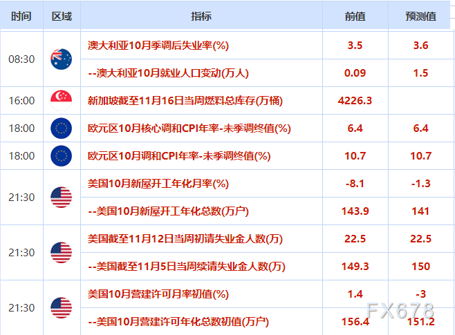 本交易日需要留意澳大利亚10月份就业数据、美国10月新屋开工和营建许可数据,关注美国初请失业金人数变动、美联储官员讲话和英国预算声明。