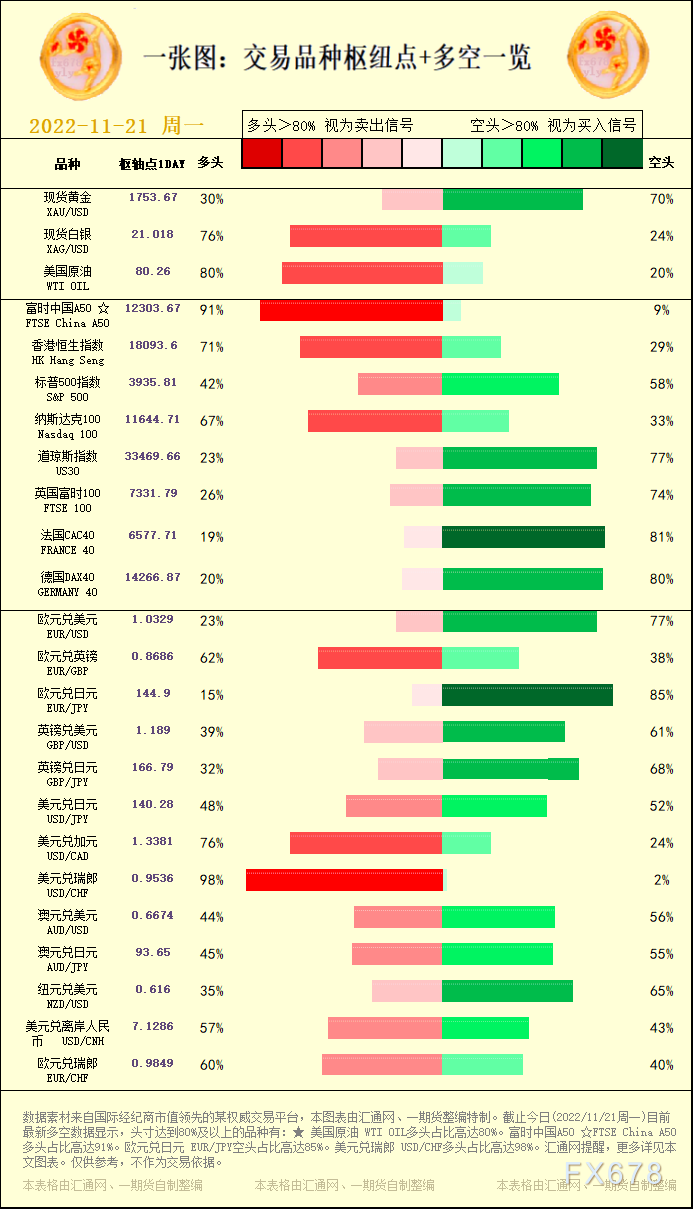 一张图:交易品种枢纽点+多空占比一览。截止今日(2022/11/21周一)目前最新多空数据显示,头寸达到80%及以上的品种有:★ 美国原油 WTI OIL多头占比高达80%。富时中国A50 ☆FTSE China A50多头占比高达91%。欧元兑日元 EUR/JPY空头占比高达85%。美元兑瑞郎 USD/CHF多头占比高达98%。,更多详见本文图表。仅供参考,不作为交易依据。