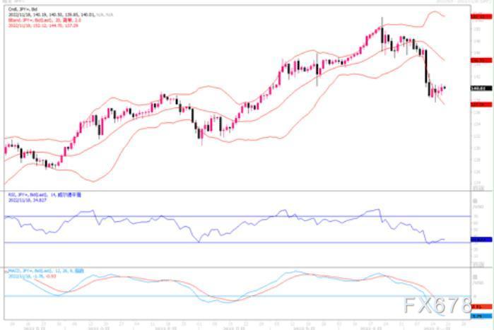 周四,日本央行行长黑田东彦发表讲话,称日本央行将维持宽松的货币政策以支持经济,以稳定、持续的方式实现2%通胀目标。为此,当日日元兑美元下跌0.47%,报收于140.18。日线图上整体维持下行,但短线在138.50一线整理,随机指标倾向反弹。4小时图在前期低点一线有明显支持,短线不排除有进一步反弹的可能性。小时图窄幅波动,缺乏动能。日内留意上方初步阻力140.50水平,若突破,进一步的阻力水平将是141.75-142.00区域,更强的阻力是前期高位横盘区间支撑水位145.00。