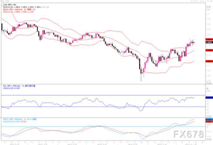 周四(11月17日),欧元对美元略微下跌0.5%,报收于1.0341。据知情人士透露,欧洲央行决策者可能会放慢加息速度,下个月将仅加息50个基点。知情人士提到的理由包括,经济衰退的风险越来越大、消费者价格压力可能会减弱以及将存款利率上调50个基点至2%,将达到接近中性水平,不会再刺激经济。有关这一消息,欧央行的官员未做出回应。距离12月15日欧央行央行今年最后一次决策会议还有四周时间,欧洲央行仍有足够时间做出斟酌。隔夜外汇市场上,虽然上述消息稍不利于欧元,但考虑到美联储也具有减低加息幅度的预期,因此欧元并未因此受到太大的空头冲击。日图显示在1.05关口前,欧元多头遇阻显得上冲力不够,随机指标倾向自超买区域回落,短线警惕回调风险。4小时图高位剧烈拉锯,上行未能再创新高。小时图波幅有所收敛,三角形态即将突破。短线还是要主防冲高回落风险,下方关键的支撑在1.03这个前期横盘区间上沿,若跌穿或就宣告欧元此轮反弹失败。相反,若能坚守在上述水平之上,则后市存在继续尝试冲击1.05的可能性。