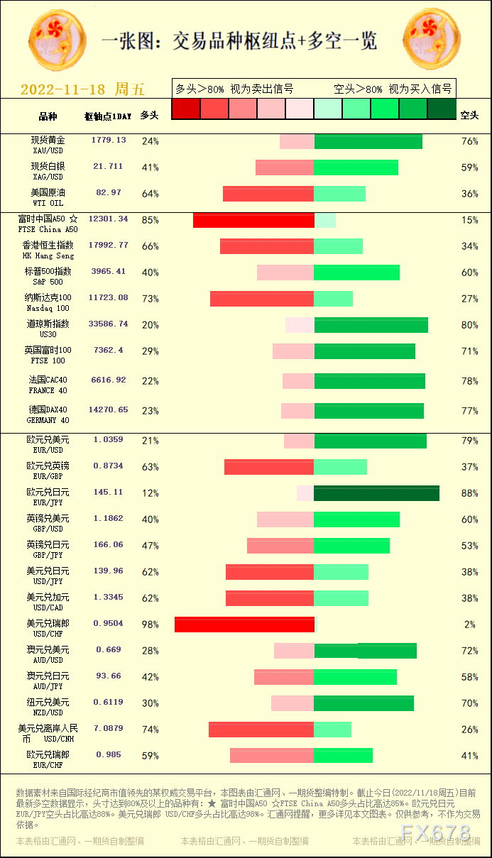 一张图:交易品种枢纽点+多空占比一览。截止今日(2022/11/18周五)目前最新多空数据显示,头寸达到80%及以上的品种有:★ 富时中国A50 ☆FTSE China A50多头占比高达85%。欧元兑日元 EUR/JPY空头占比高达88%。美元兑瑞郎 USD/CHF多头占比高达98%。,更多详见本文图表。仅供参考,不作为交易依据。