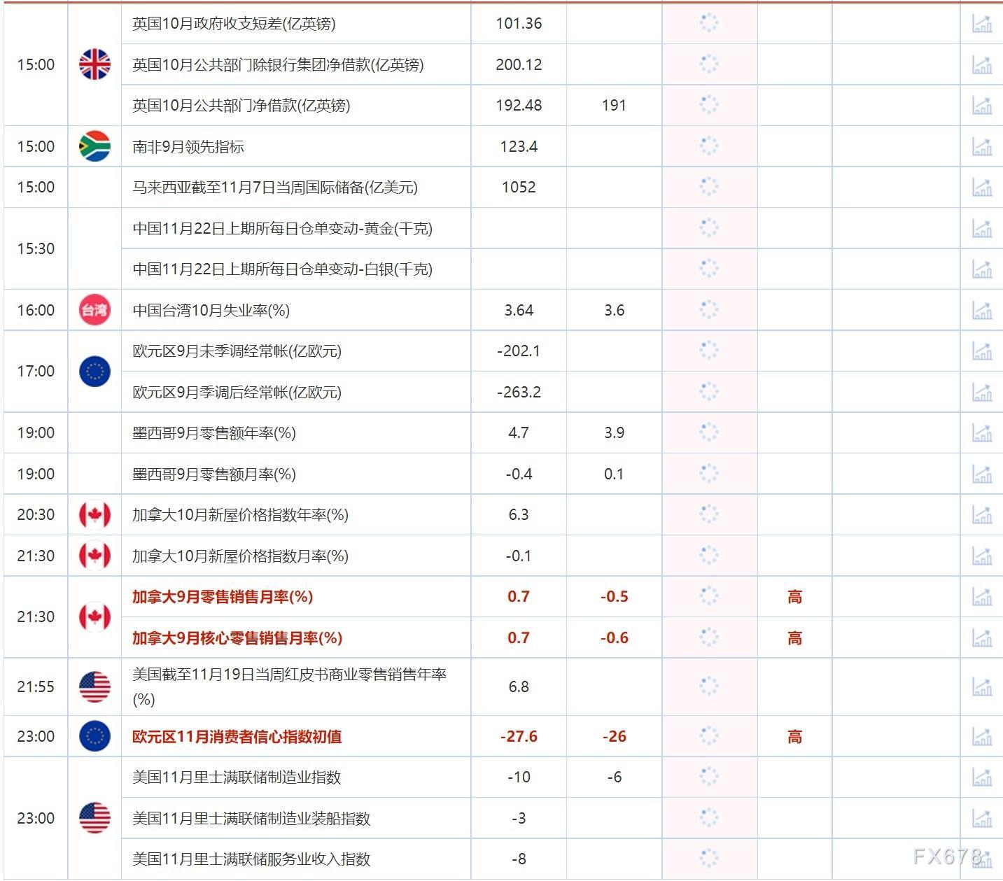 11月22日,投资者需要关注的重点数据:新西兰10月贸易帐,欧元区9月未季调经常帐,欧元区9月季调后经常帐,加拿大9月零售销售月率,加拿大9月核心零售销售月率,欧元区11月消费者信心指数初值和美国11月里士满联储制造业指数。需要关注的大事件包括澳洲联储主席洛威发表讲话,欧洲央行管委霍尔茨曼和雷恩发表讲话。