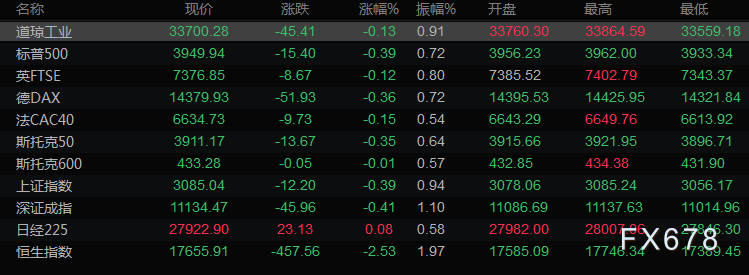 美股收盘情况:道琼斯工业指数下跌0.13%,至33700.28点;标普500指数.SPX下跌0.39%,至3949.94点;纳斯达克指数下跌1.09%,至11024.51点。