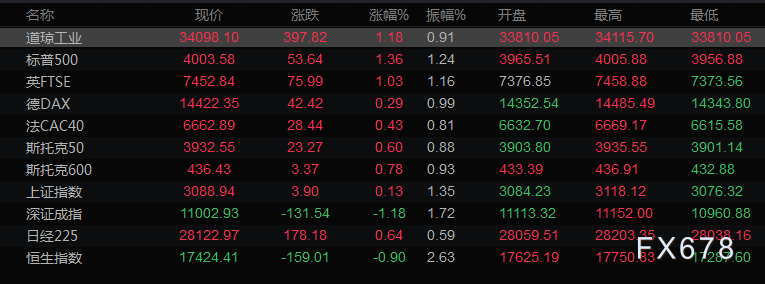美股收盘情况:道琼斯工业指数上涨1.18%,至34098.1点;标普500指数上涨1.36%,至4003.58点;纳斯达克指数上涨1.36%,至11174.41点。
