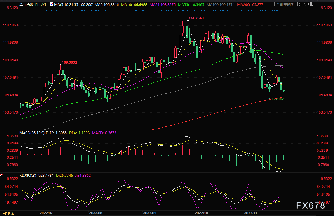 周四(11月24日)亚市盘初,美元指数小幅下探,一度创逾一周新低至105.92,延续隔夜跌势。美元周三全线下跌,此前美联储公布的11月会议记录显示,联储大多数决策者同意很快就应该放缓加息步伐;另外美国11月Markit制造业PMI数据差于预期,也对美元产生拖累。周三美元指数收跌0.95%,为11月14日以来最大单日跌幅,收报106.14;非美货币普遍大涨,英镑和纽元均创下逾三个月新高。