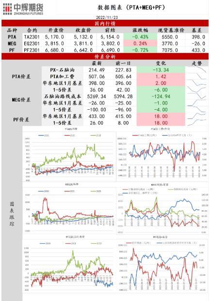 (2)PX方面:截至11月18日,国内PX开工负荷在73.1%(较上期下降0.10%)。威联化学二期100万吨装置计划于11月下投产,镇海炼化75万吨装置计划于11月末附近重启,近期装置开工率预计上升,随着PX供应偏紧格局逐渐缓解,其对PTA的成本支撑或将减弱。