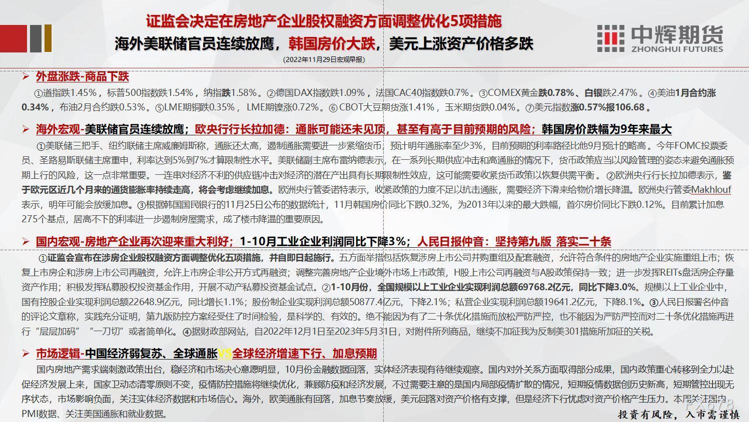 11月29日,中辉期货发布宏观早报,称海外美联储官员持续放鹰,美元上涨资产价格多跌,本周关注国内PMI数据,关注美国通胀和就业数据。