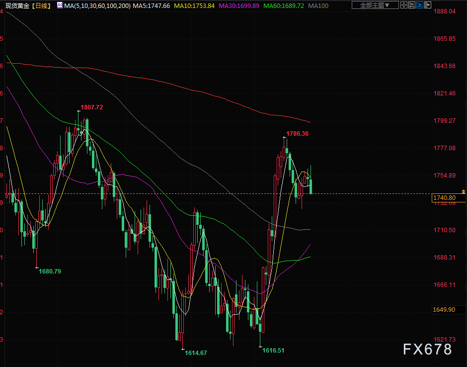 金价周一从逾一周高位回落,美元从盘中低位回升,美联储官员做出鹰派发言,重申对抗通胀的承诺。现货金下跌0.8%,报每盎司1741.35美元,盘中稍早触及11月18日以来最高。