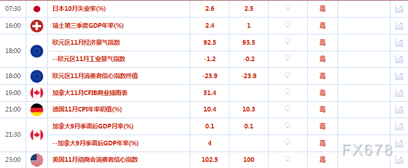 美联储主席鲍威尔将于周三在布鲁金斯学会的一个活动上发表讲话,讨论美国经济和劳动力市场的前景。 另外,美国11月非农就业数据将于周五公布,这可能会改变对美联储12月政策动向的预期。交易员们目前预计会上将加息50个基点。