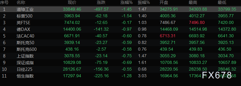 美股收盘情况:标普500指数下跌1.54%,收于3963.95点;纳斯达克指数下跌1.58%,至11049.50点;道琼斯工业指数下跌1.45%,至33849.46点。