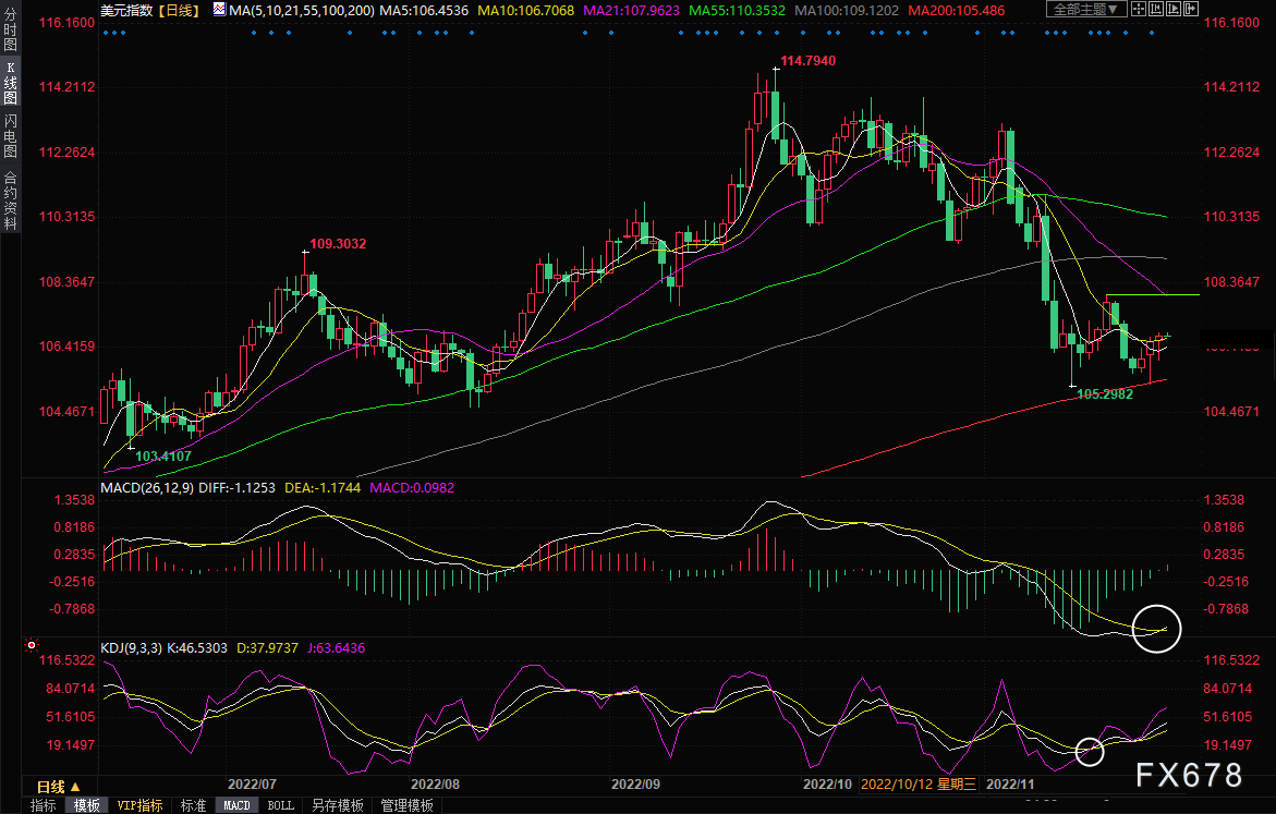 从技术面来看,美元指数连续三个交易日收涨,且守住了200日均线关键支撑,过去两个交易日录得带下影线的阳线,暗示下方买盘较强,MACD初步金叉,美元的短线看涨信号有所增强,有望震荡上探21日均线107.96附近阻力,11月21日触及的近两周高点和108整数关口阻力也都在该位置附近。下方留意5日均线106.45附近支撑。