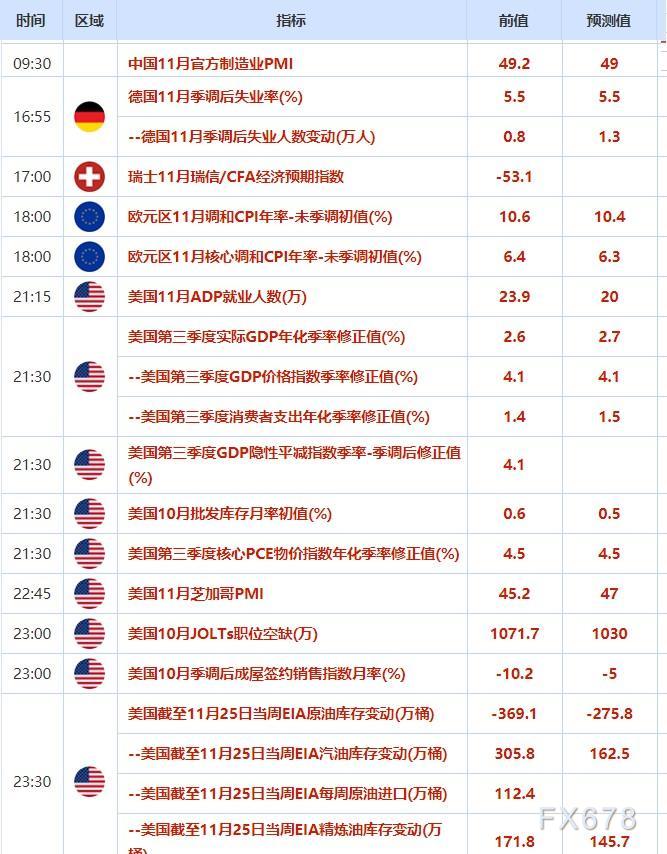 本交易日有一系列经济数据出炉,亚洲时段将迎来澳大利亚10月CPI数据、中国11月PMI数据,欧洲时段将出炉德国11月失业、英国央行首席经济学家皮尔讲话和欧元区11月CPI数据,纽约时段将公布美国11月ADP数据、美国三季度GDP修正值、美国10月JOLTs职位空缺数据。