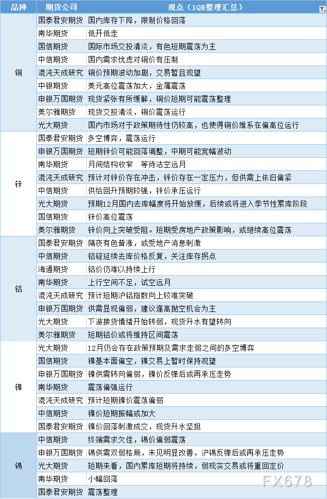 期货公司观点汇总一张图:11月29日有色系(铜、锌、铝、镍、锡等)