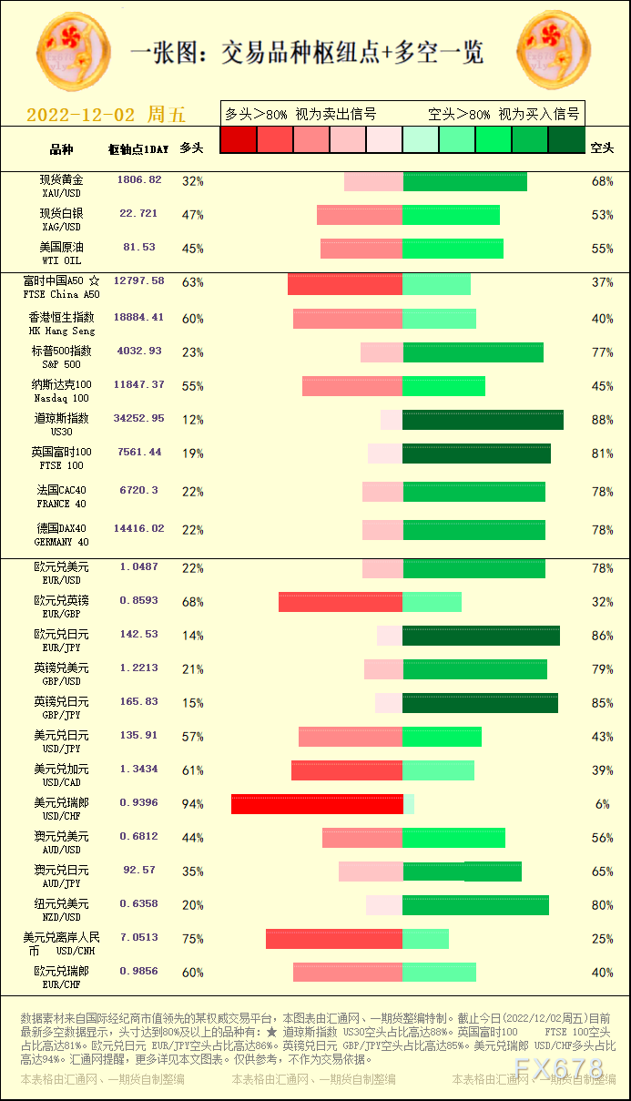 讯——一张图:交易品种枢纽点+多空占比一览。截止今日(2022/12/02周五)目前最新多空数据显示,头寸达到80%及以上的品种有:★ 道琼斯指数 US30空头占比高达88%。英国富时100 FTSE 100空头占比高达81%。欧元兑日元 EUR/JPY空头占比高达86%。英镑兑日元 GBP/JPY空头占比高达85%。美元兑瑞郎 USD/CHF多头占比高达94%。,更多详见本文图表。仅供参考,不作为交易依据。